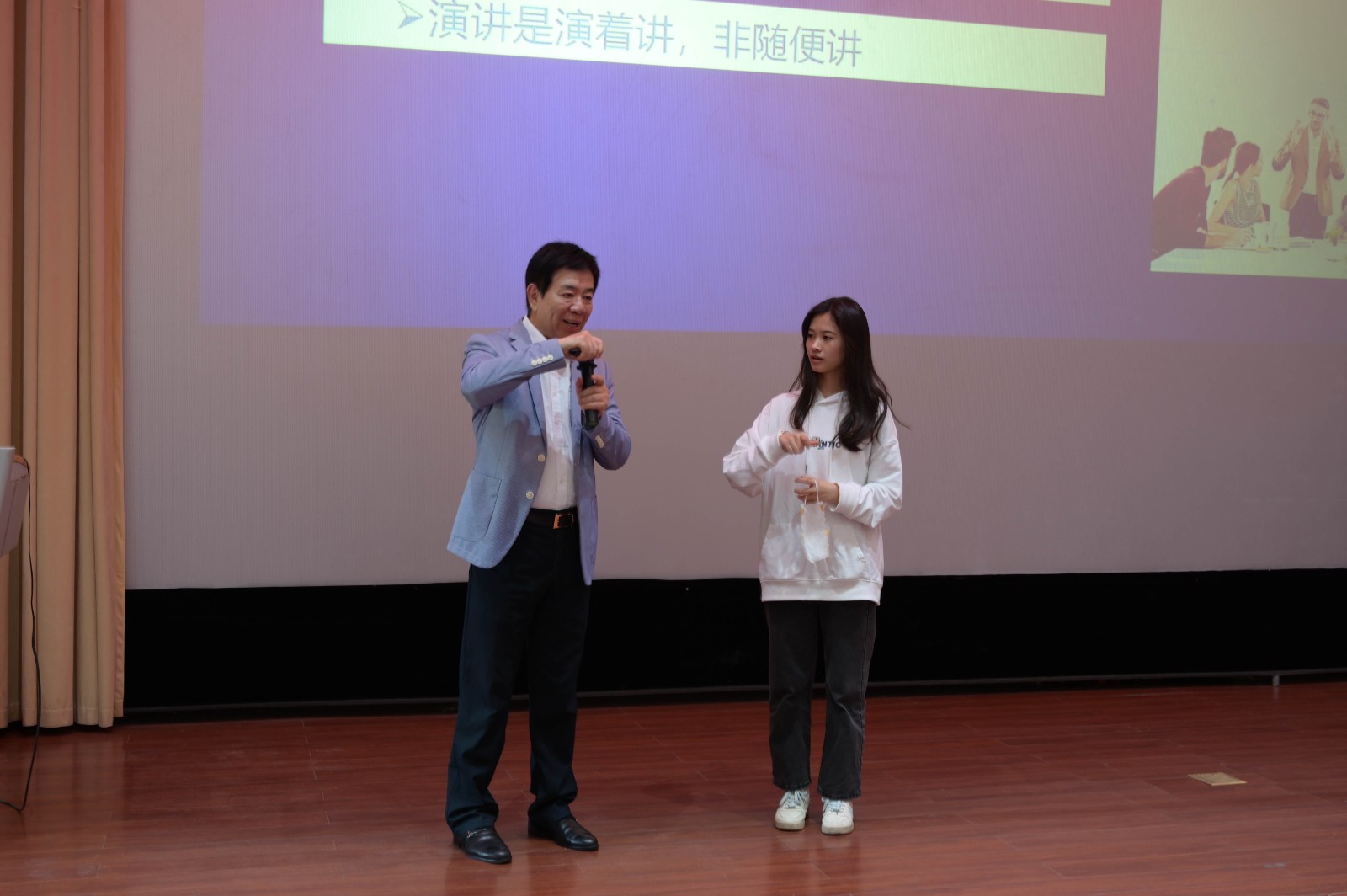 开讲前,汤聪老师给学校师生介绍了线下上演讲培训课的好处,他指出,线下授课不仅可以让学生与讲师有更多的互动,还能让学生走上讲台演讲,发现自己的不足之处,从而得到改进。