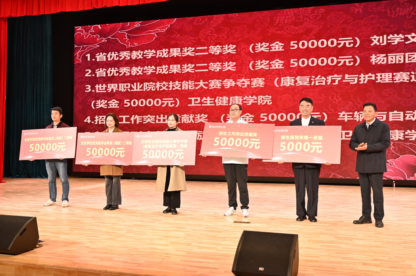 最后,董事长欧阳少林颁发董事会特别奖,表彰刘学文团队、杨丽团队及卫生健康学院、车辆与自动化学院等在教学成果、技能大赛、招生与报到率方面的突出贡献。