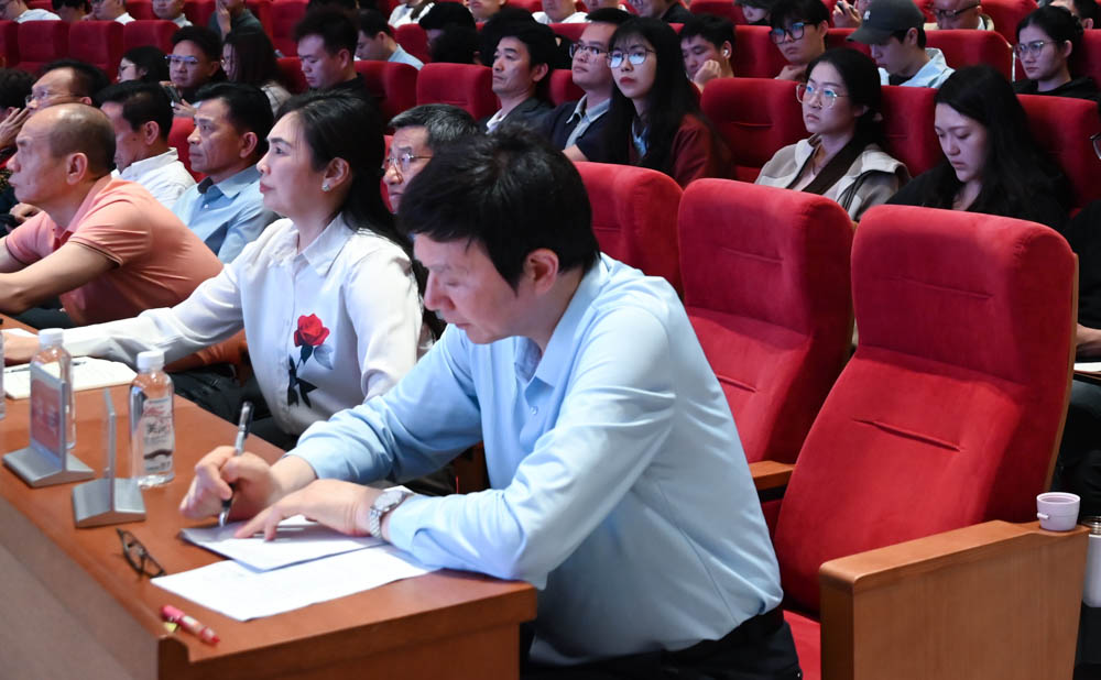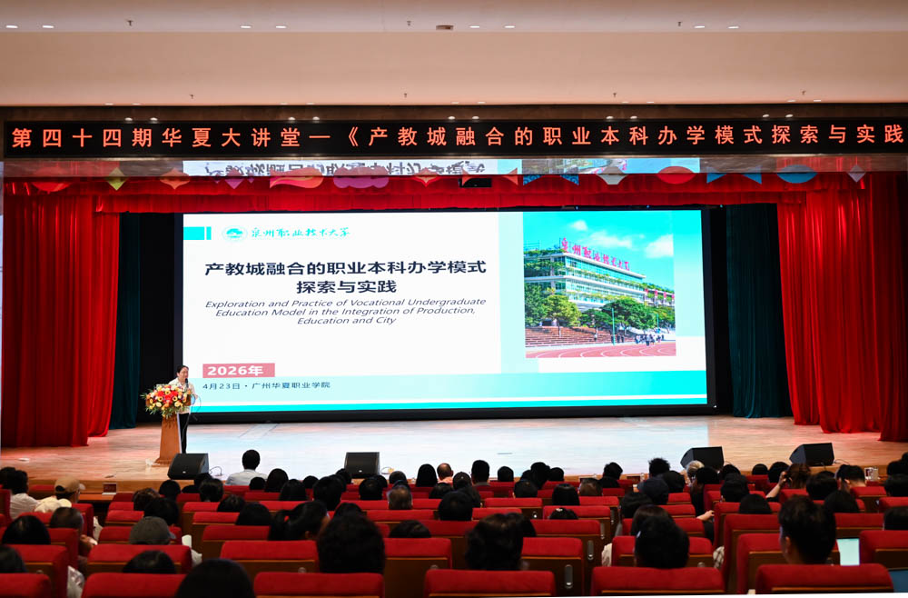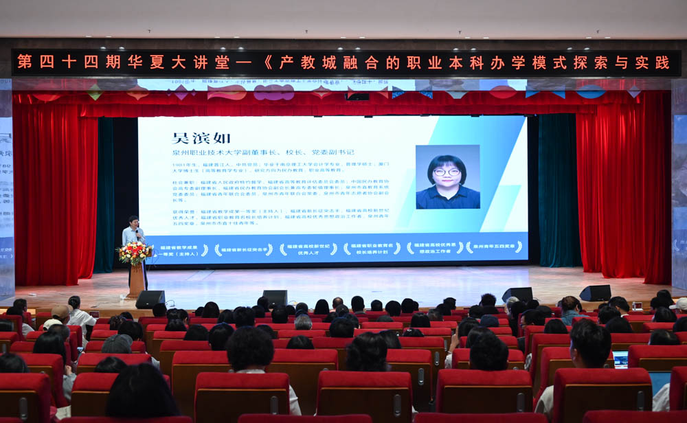 为深入推进现代职业教育高质量发展,助力学校“新双高”创建与职业本科大学申办两大核心任务落地,4月23日下午,第44期“华夏大讲堂”专题讲座顺利开讲。泉州职业技术大学校长吴滨如应邀出席作《产教城融合的职业本科办学模式探索与实践》专题辅导报告,学校校长李先祥主持大讲堂并致欢迎辞,学校董事长欧阳少林、管委会执行主任邹建华,全体校领导班子、中层干部和教职工600余人参会学习。